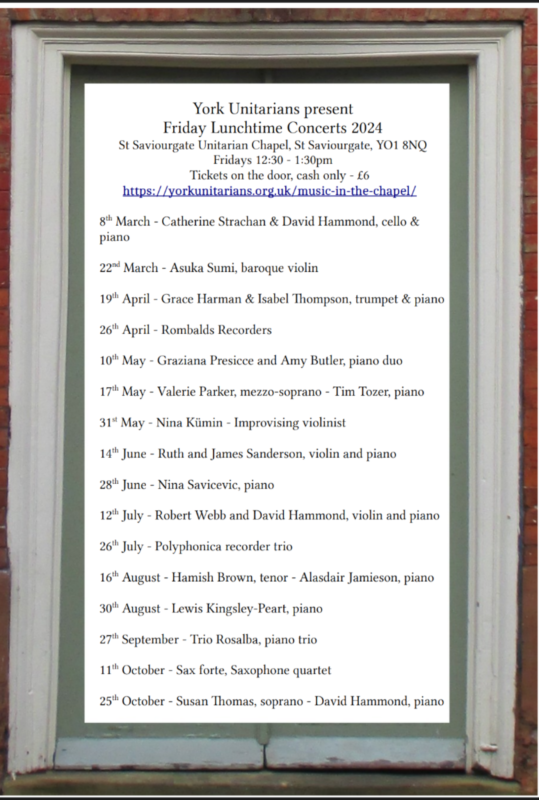 Tickets at the door £6 (cash only), proceeds support the musicians and chapel.